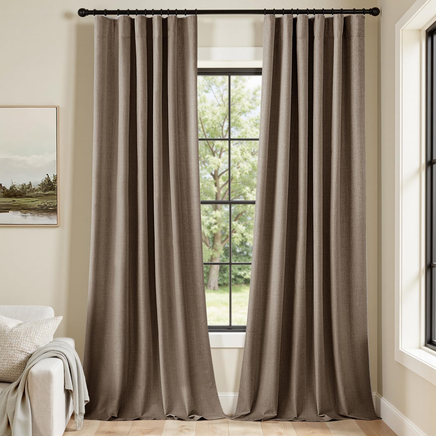 - INNOVATED MATERIAL: Crafted from premium thick linen-like fabric with a substantial weight of 350 GSM, these curtains surpass standard blackout options in thickness, luxurious texture, and functionality. The advanced four-layer coating ensures 100% light blocking, insulation against heat and cold, and effective noise reduction. The vintage burlap texture adds timeless charm and highlights their high-quality feel. Energy-efficient and durable, they provide privacy and a cozy atmosphere year-round