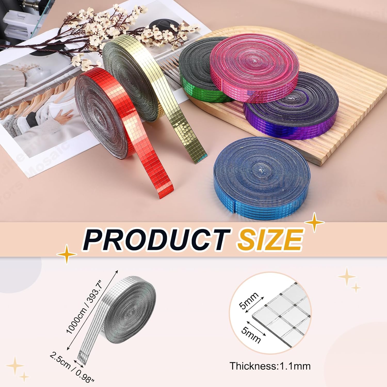 - Specification: Color: Silver Tone; Material: Glass; Size:1000x2.5cm/393.7x0.98Inch(LxW); Thickness:1.1mm/0.04inch; Each Tile Size: 5x5mm/0.2x0.2inch; Packing List: 10000 Pcs x Self Adhesive Mirrors Mosaic Tiles (Roll of 1)