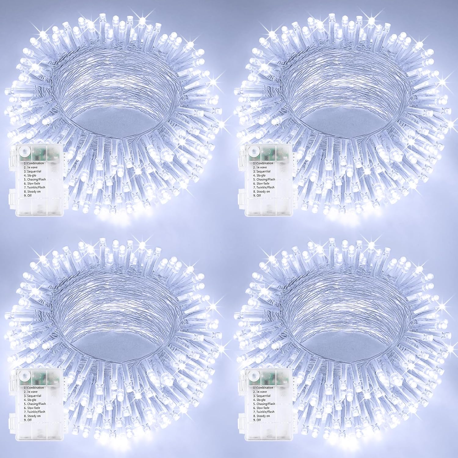- Ultra-Bright and Durable Battery Powered String Lights: Each string light is 33 feet, features 100 super bright LEDs and a waterproof battery case with 8 lighting modes to ensure longevity and reliability. The cool white Christmas lights emit a bright, modern glow in the dark, making them an ideal choice for indoor and outdoor decorations. These fairy lights are perfect for Christmas, birthdays, parties, weddings, creating a cozy and joyful atmosphere.
