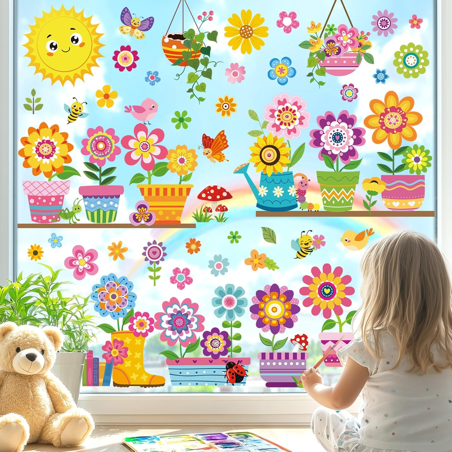 decalmile Spring Summer Kids Multicolor Flower Double Sided Window Clings Colorful Floral Garden Potted Sun Anti-Collision Glass Doors Window Stickers Decals