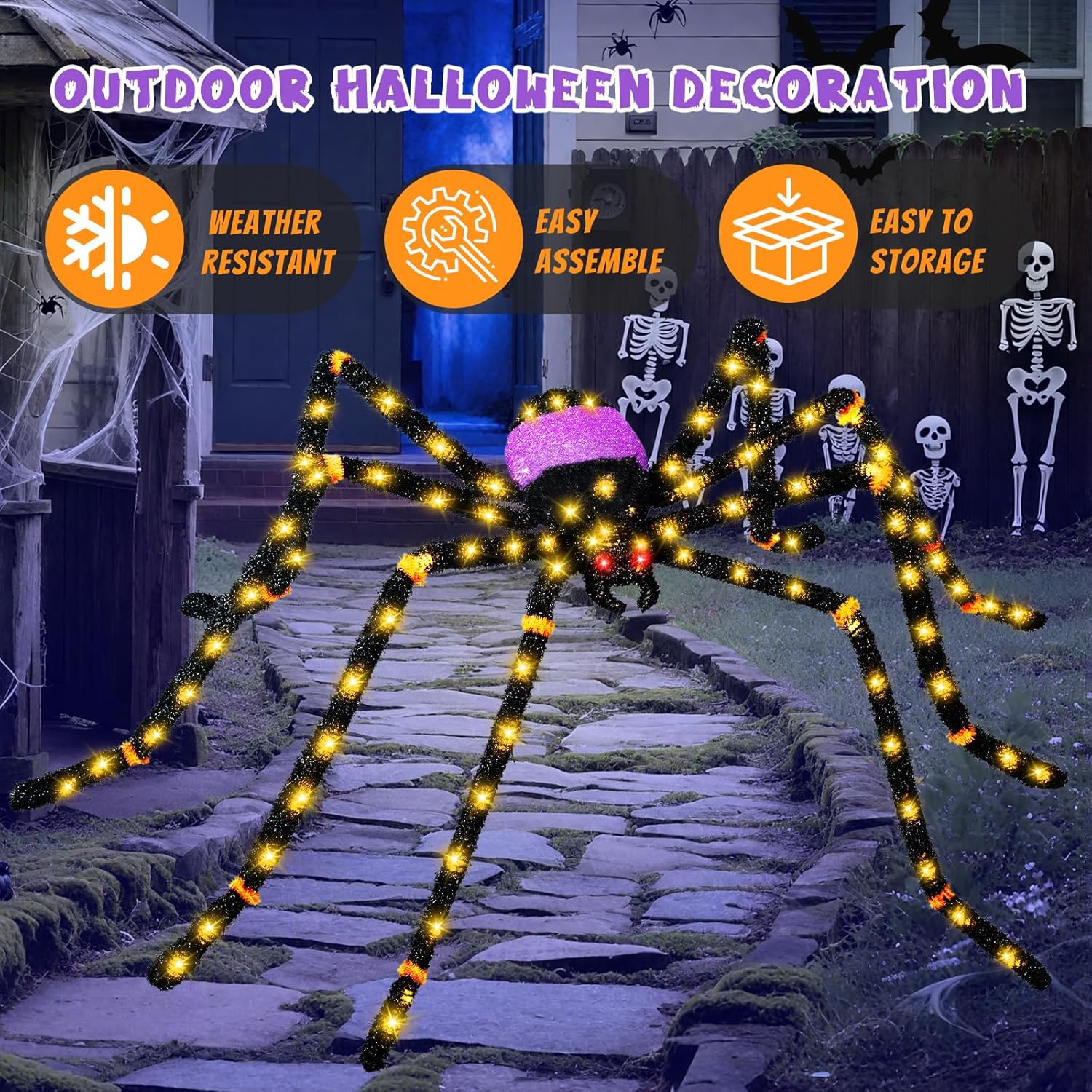 - 🕷 Realistic Hairy Giant Spider: Spanning a massive 66-86 inches when extended, our ultra-lifelike giant spider Halloween decorations features hairy texture and scary glowing red eyes to dominate gardens, front yards, or hung securely on exterior walls.