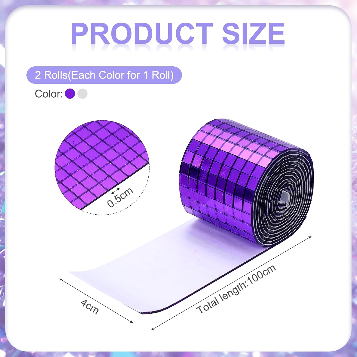 - we provide here, are in the size of: Size: Each roll measures 4 x 100cm (total 2 meters) ; Material: glass with strong adhesive backing ; Color: 1 roll of Purple + 1 roll of Silver (total 2 rolls) ; In the package of: 3200 Pieces Adhesive Mosaic Tiles 5 x 5 mm Disco Tiles 2 Rolls (Purple & Silver)