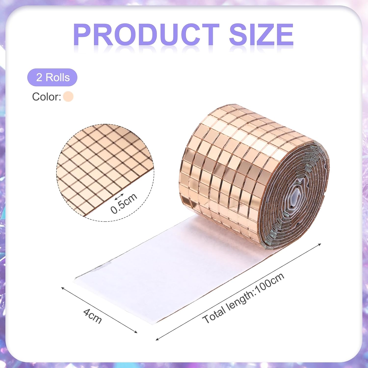 - we provide here, are in the size of: Size: Each roll measures 4 x 100cm (total 2 meters) ; Material: glass with strong adhesive backing ; Color: 2 roll of Rose Gold (total 2 rolls) ; In the package of: 3200 Pieces Adhesive Mosaic Tiles 5 x 5 mm Disco Tiles 2 Rolls (Rose Gold)
