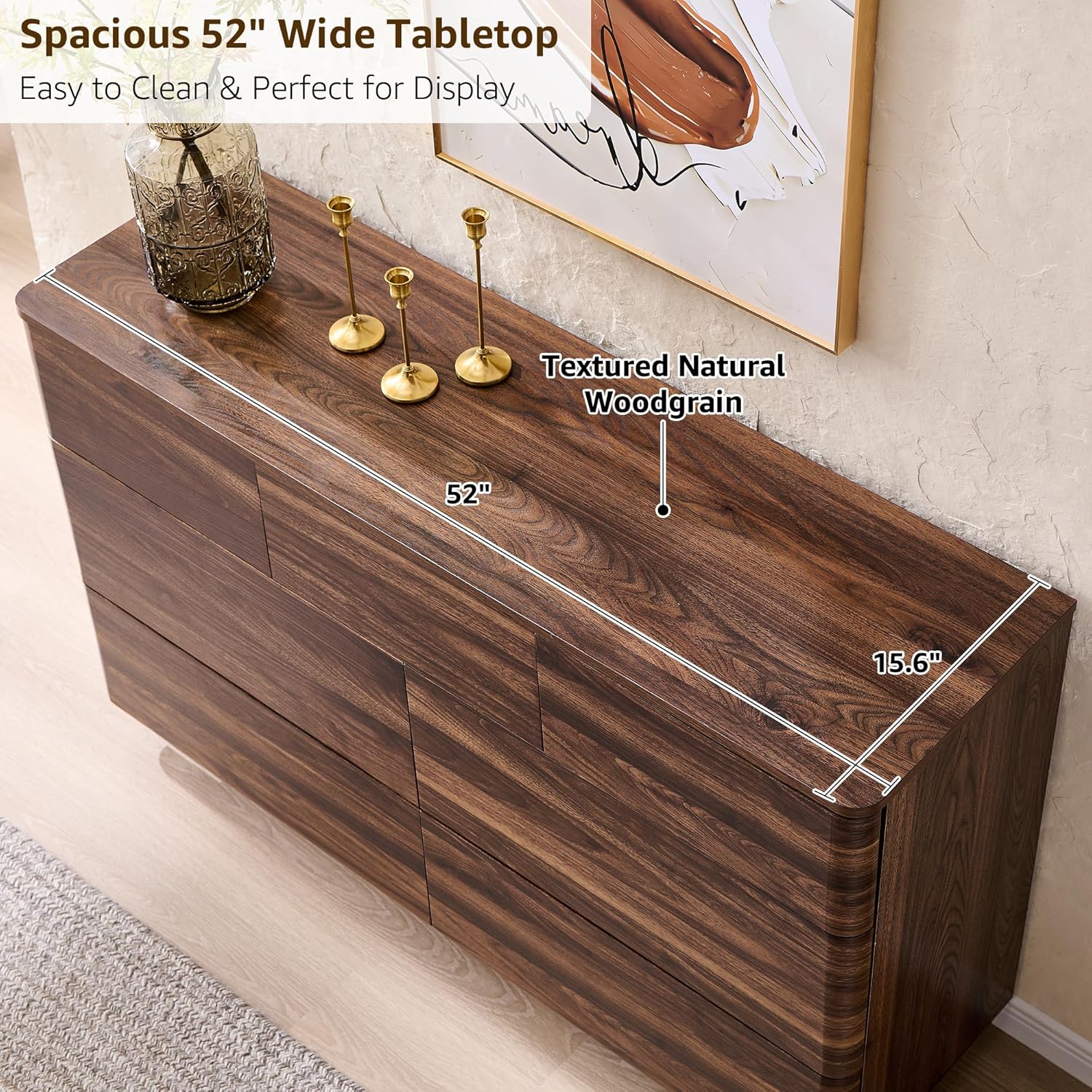 - Spacious 52" Wide Top Surface – Doubles as a Stylish Dresser TV Stand: The large tabletop (52"W x 15.6"D) offers plenty of room and features a smooth curved design with natural flow. Paired with a unique wood grain finish, it creates a stylish backdrop perfect for showcasing photo frames, decorative accents, or even holding a flat-screen TV up to 65 inches. The waterproof, stain-resistant surface makes cleanup a breeze—just wipe it down with a dry or damp cloth to keep it looking spotless