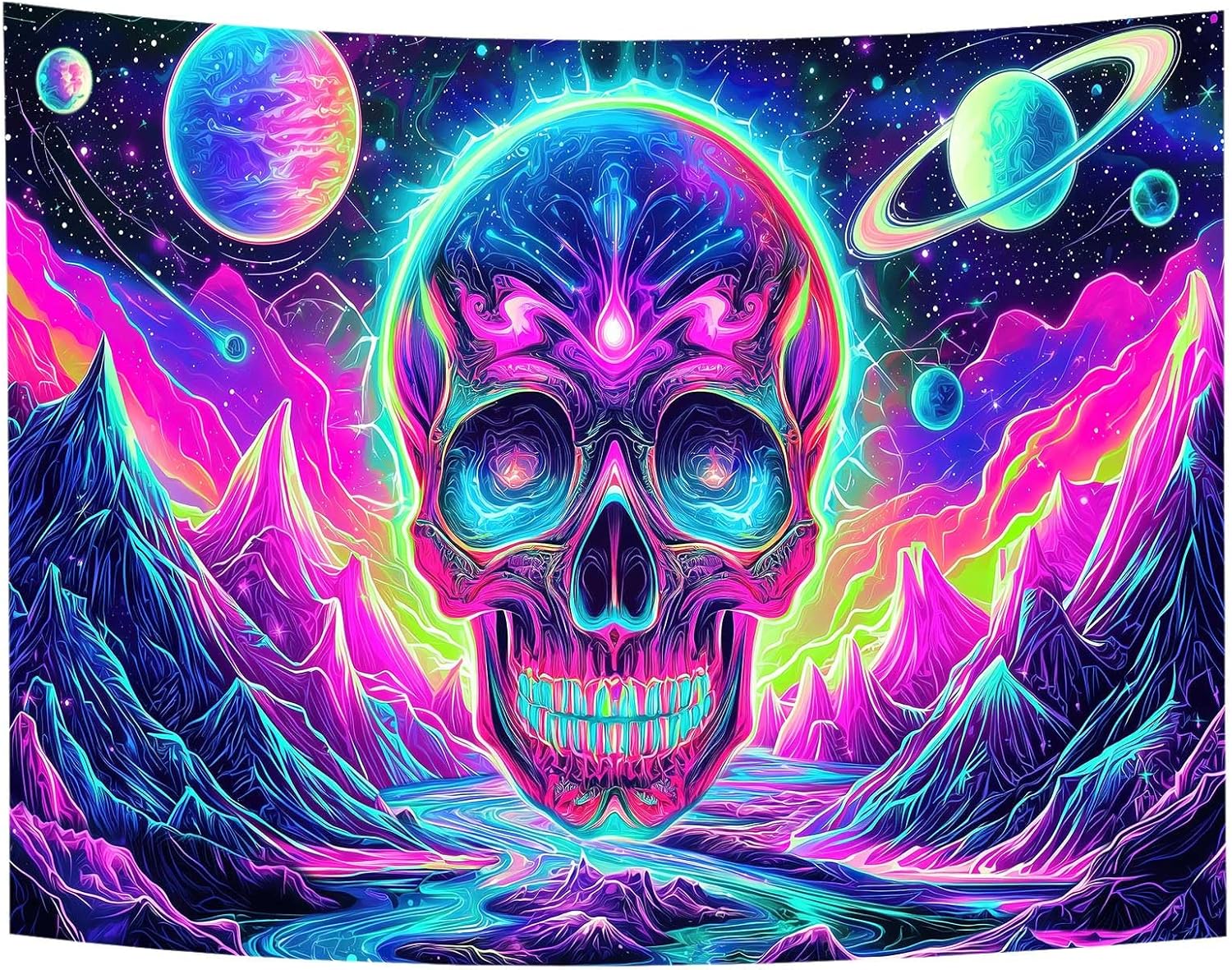 Blacklight Skull Tapestry, UV Reactive Gothic Skeleton Mountain Galaxy Planet Wall Hanging Tapestries, Glow in the Dark Horror Face Halloween Aesthetic Poster for Bedroom Living Room Decor 60X40IN