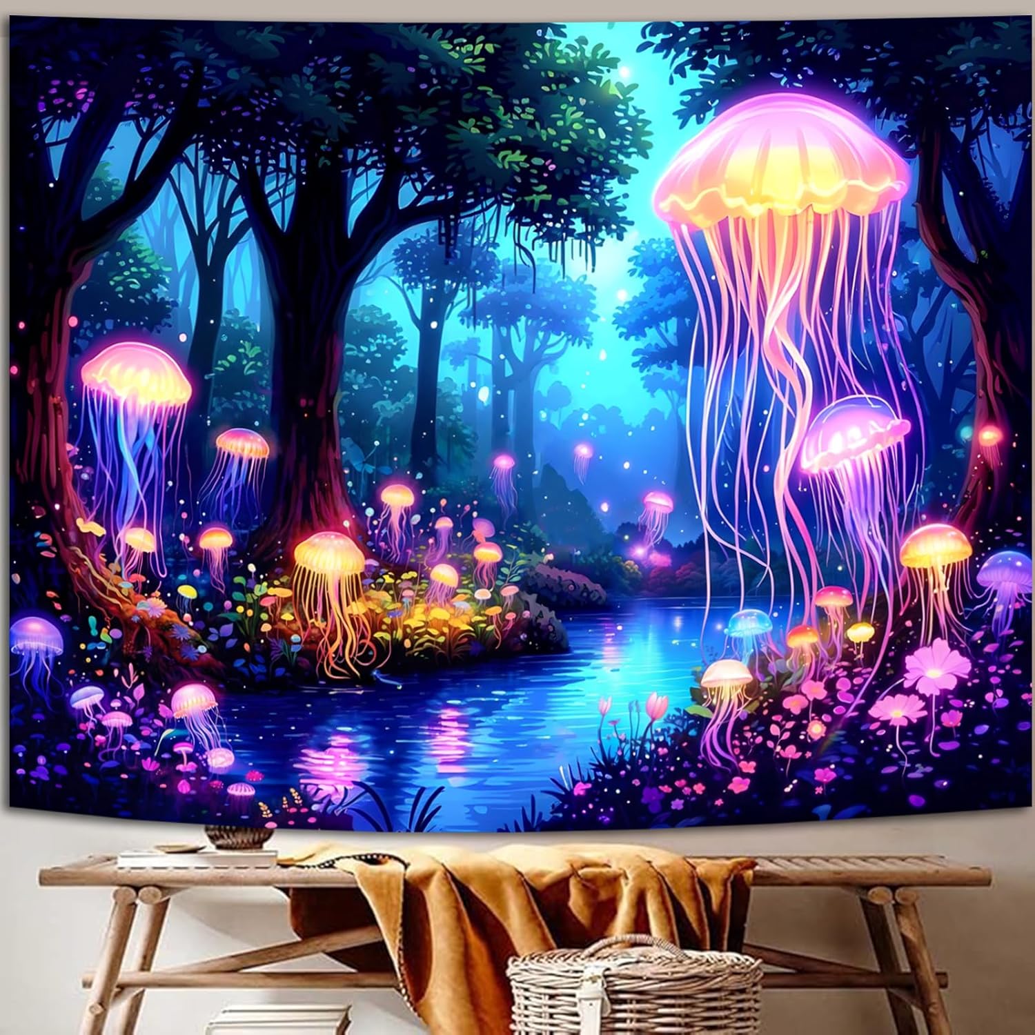 - UV Reactive Fantasy Design: This blacklight tapestry features luminous jellyfish floating through an enchanted forest scene. The vibrant colors glow brilliantly under UV light, creating a dreamlike underwater-meets-wilderness effect.