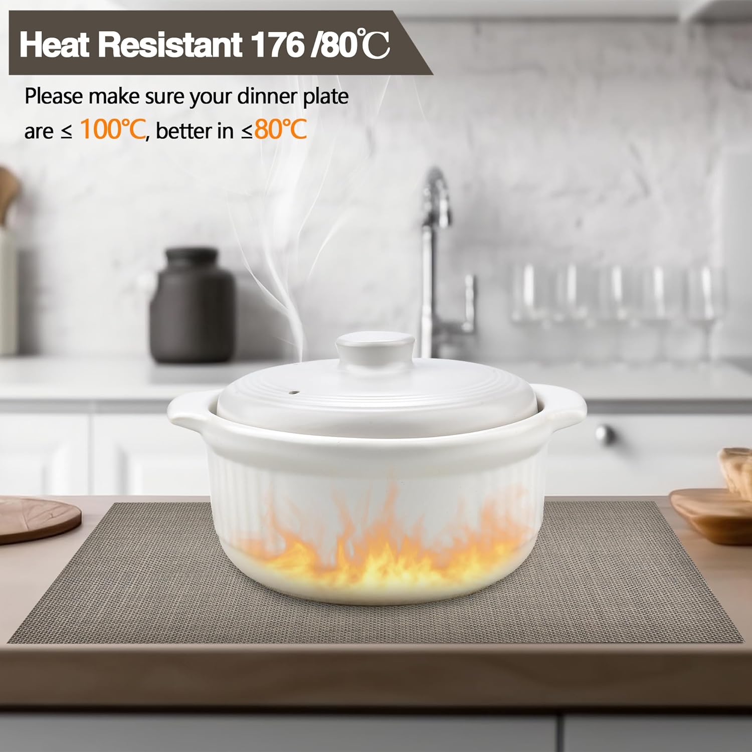 - Heat Resistant: Please make sure your dinner plate are ≤ 100℃, better in ≤80℃. It can prevent the table from slipping and scalding the countertop. These beautiful stylish vinyl place mats to add more fun to your dining table