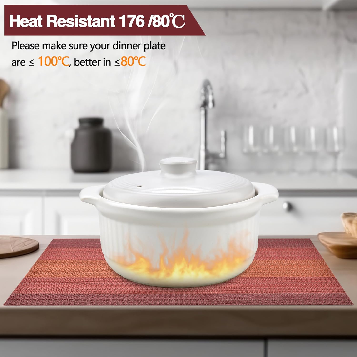 - Heat Resistant: Please make sure your dinner plate are ≤ 100℃, better in ≤80℃. It can prevent the table from slipping and scalding the countertop. These beautiful stylish vinyl place mats to add more fun to your dining table