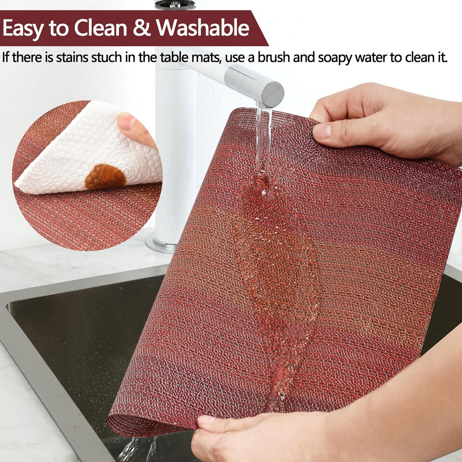 - Easy to Clean: Washable placemats easy to clean, water and oil proof, hand wash in warm soapy water and wipe dry, if there is stains stuch in the table mats, use a brush and soapy water to clean the placemats. This placemat is vertically woven and thickened, but it will have some tiny pores. It is recommended to clean in time after dinner. Size is 17.7x11.8 Inch (45x30cm) hand cut, there may be 0.2 inch error