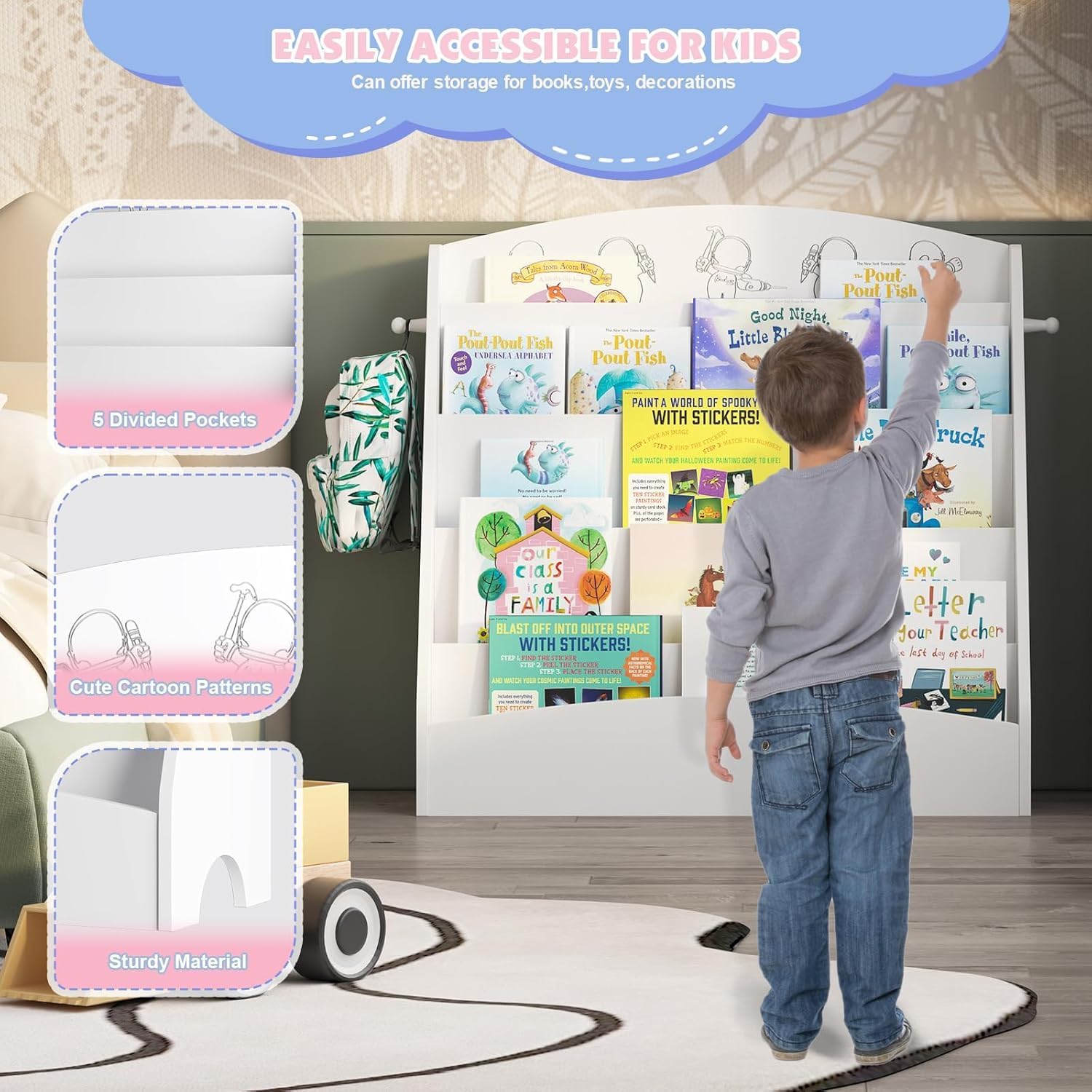 - Baby Book Rack Suitable for Multiple Scenes: This 5-tier deigned open display book shelf creates an open environment for children to read and play together in group activities. This montessori bookshelf is suitable for your child's bedroom, playroom, nursery, or living room, kindergarten, classroom,etc.