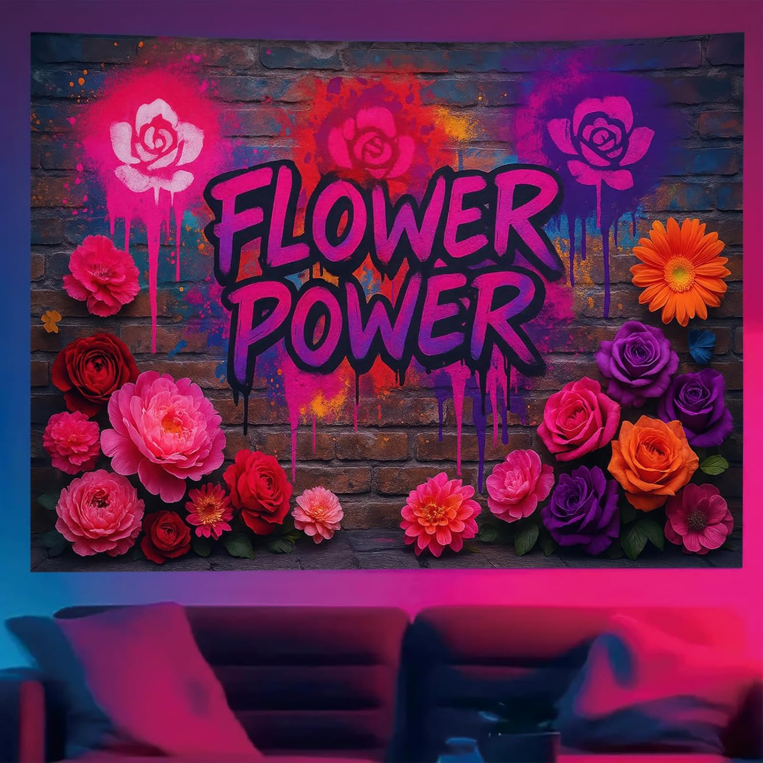 - Retro Flower Power Graffiti Style:This blacklight tapestry features bold FLOWER POWER lettering with graffiti roses on a spray-painted brick wall perfect for retro dorm decor or Y2K aesthetic rooms.