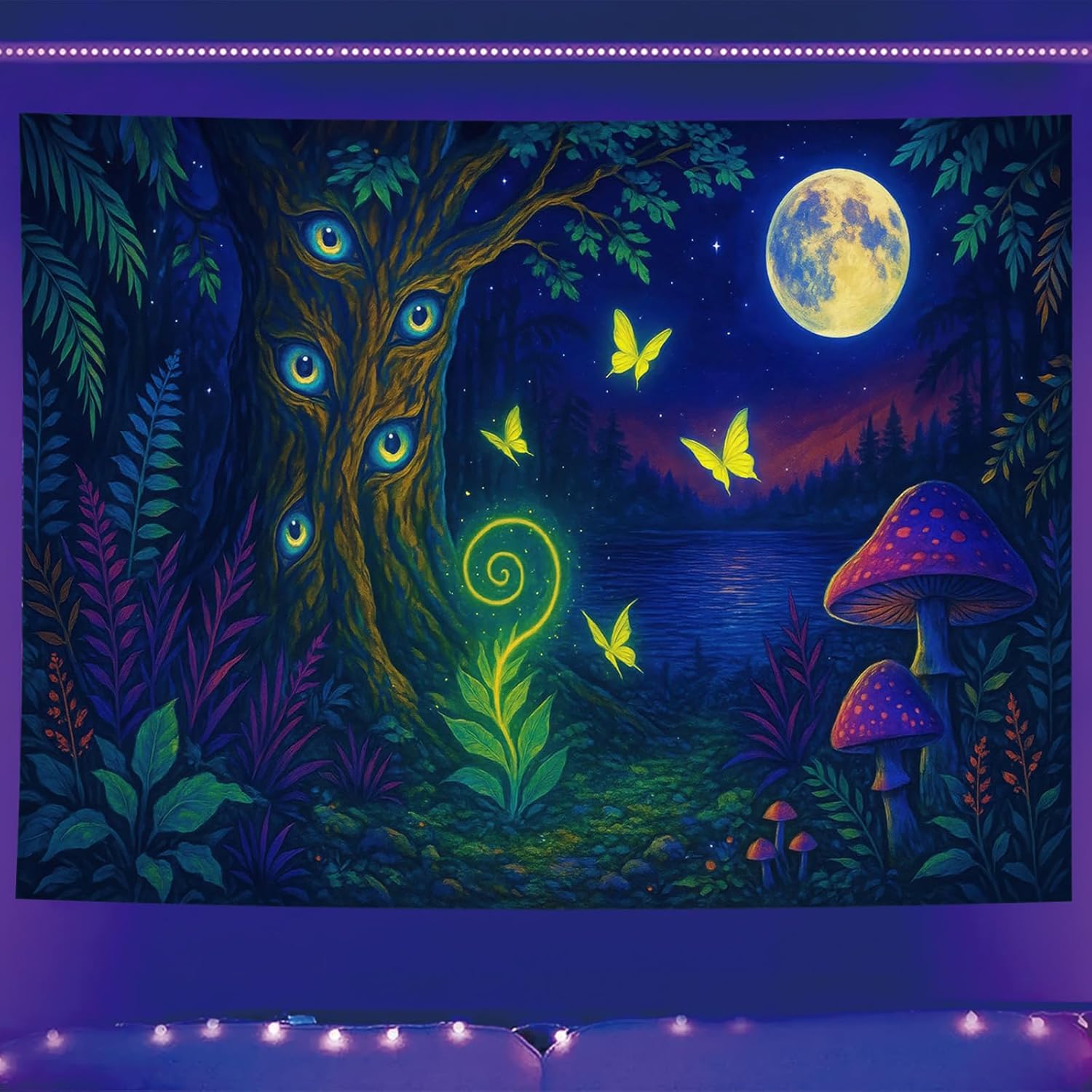 - Perfect for Fairycore and Glowing Nature Spaces:This UV reactive tapestry blends fantasy tree eyes glowing butterflies mushrooms and moonlight great for trippy bedroom walls or dreamy dorm rooms.