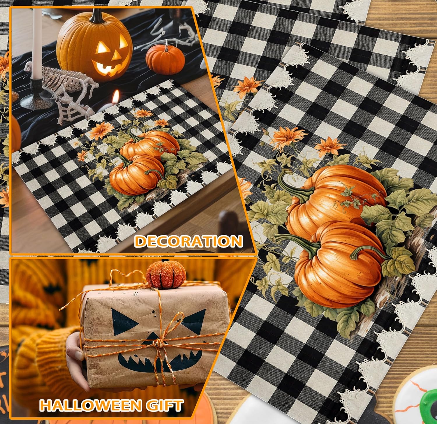 Halloween Pumpkin Placemats Set of 4, 12x18 Inch Pumpkin Plaid Table Mats, Washable Heat Resistant Place Mats for Kitchen Dining Table, Halloween Themed Decoration for Home-B07