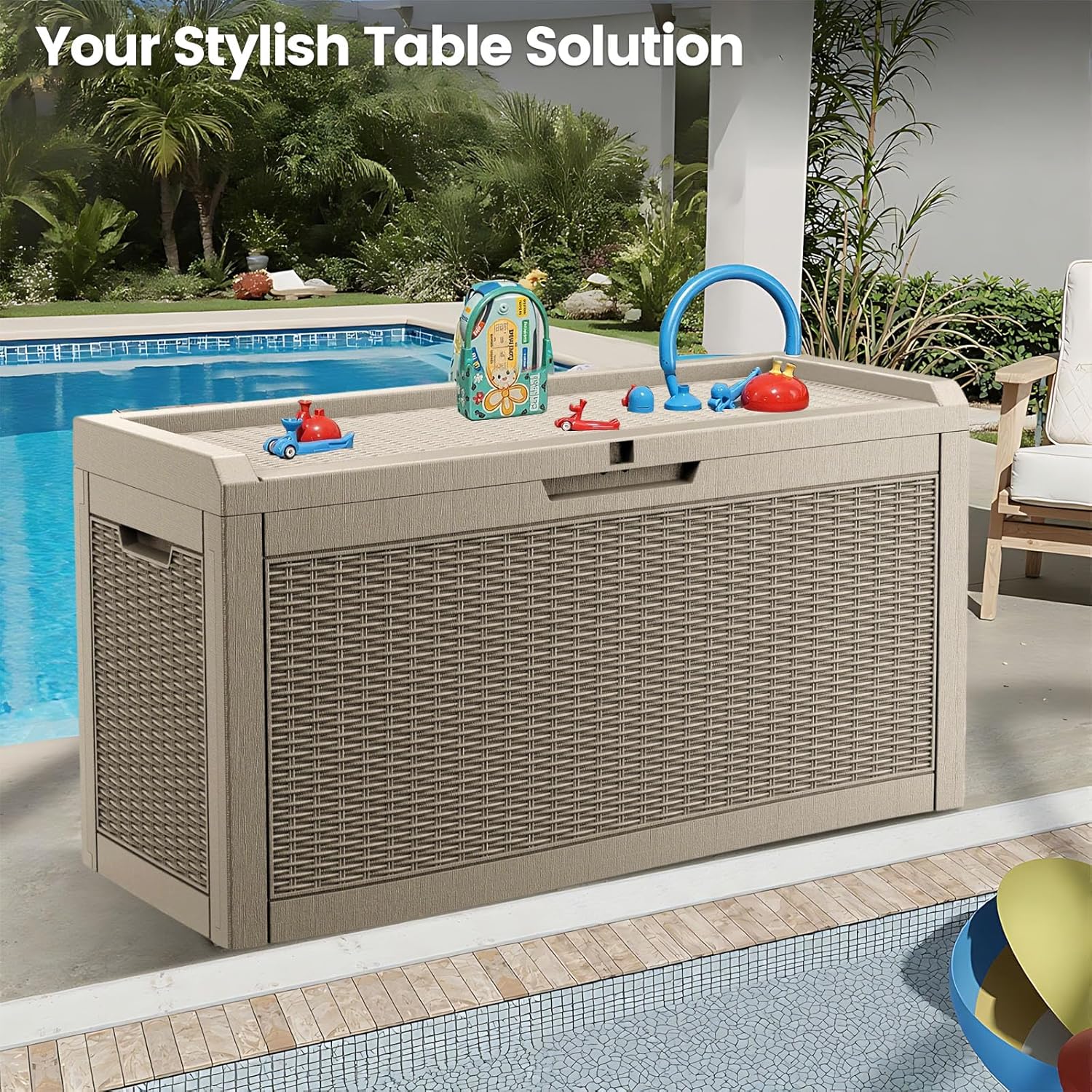 - Elegant Rattan Design: Showcasing a chic rattan effect, this deck box enhances the aesthetic of your patio, garden, or pool area. Its contemporary design seamlessly blends with any outdoor decor while offering practical storage