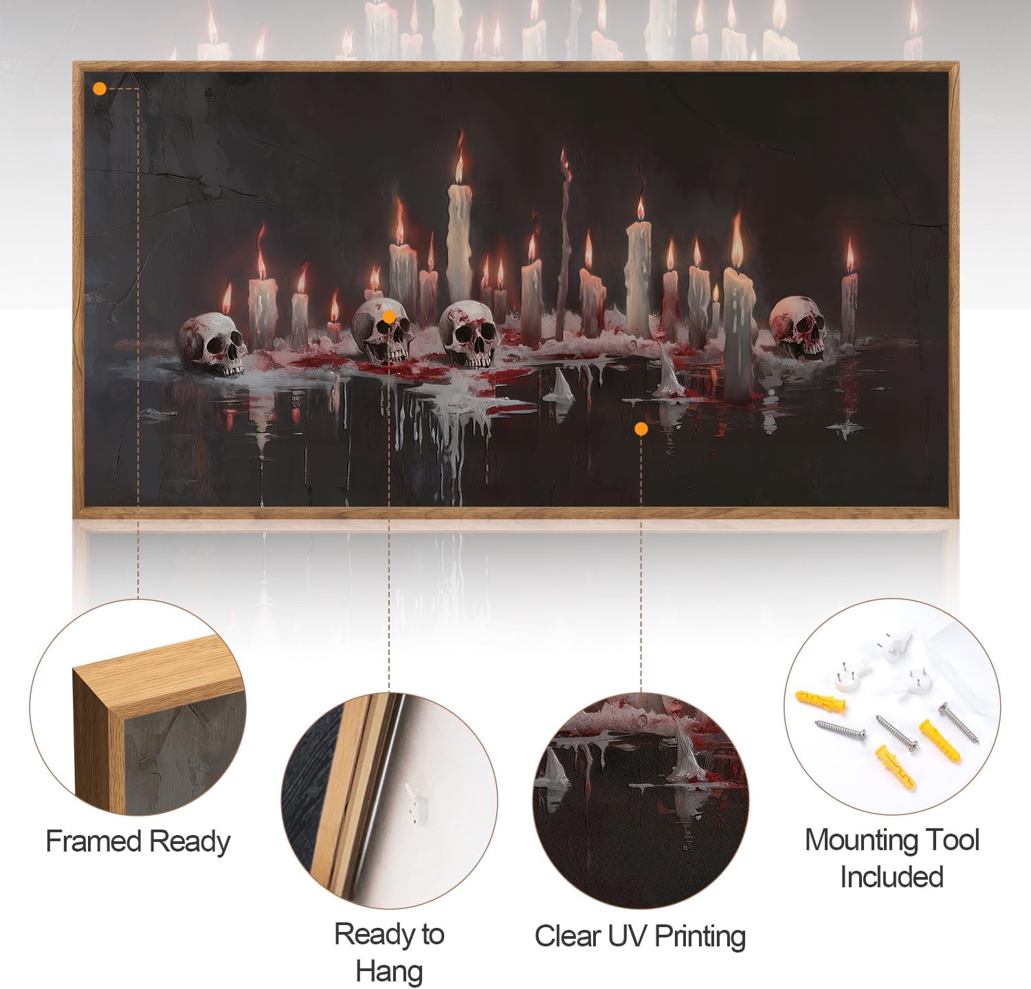 - Gothic Bloody Skull and Candles-- The details of Aurlan halloween wall art framed are exquisitely processed, such as the melted wax on the candles, the reflections and bloodstains in the liquid. The overall image gives people a sense of horror, mystery, and religious rituals.