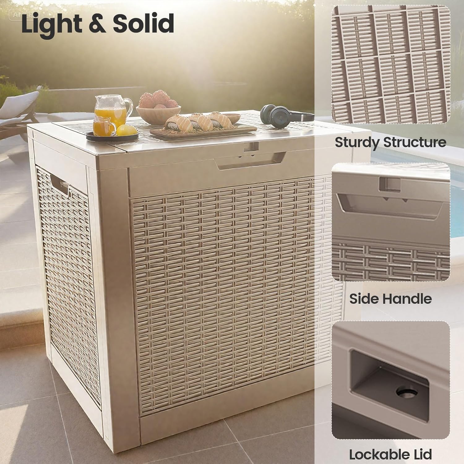 - Elegant Rattan Design: Showcasing a chic rattan effect, this deck box enhances the aesthetic of your patio, garden, or pool area. Its contemporary design seamlessly blends with any outdoor decor while offering practical storage