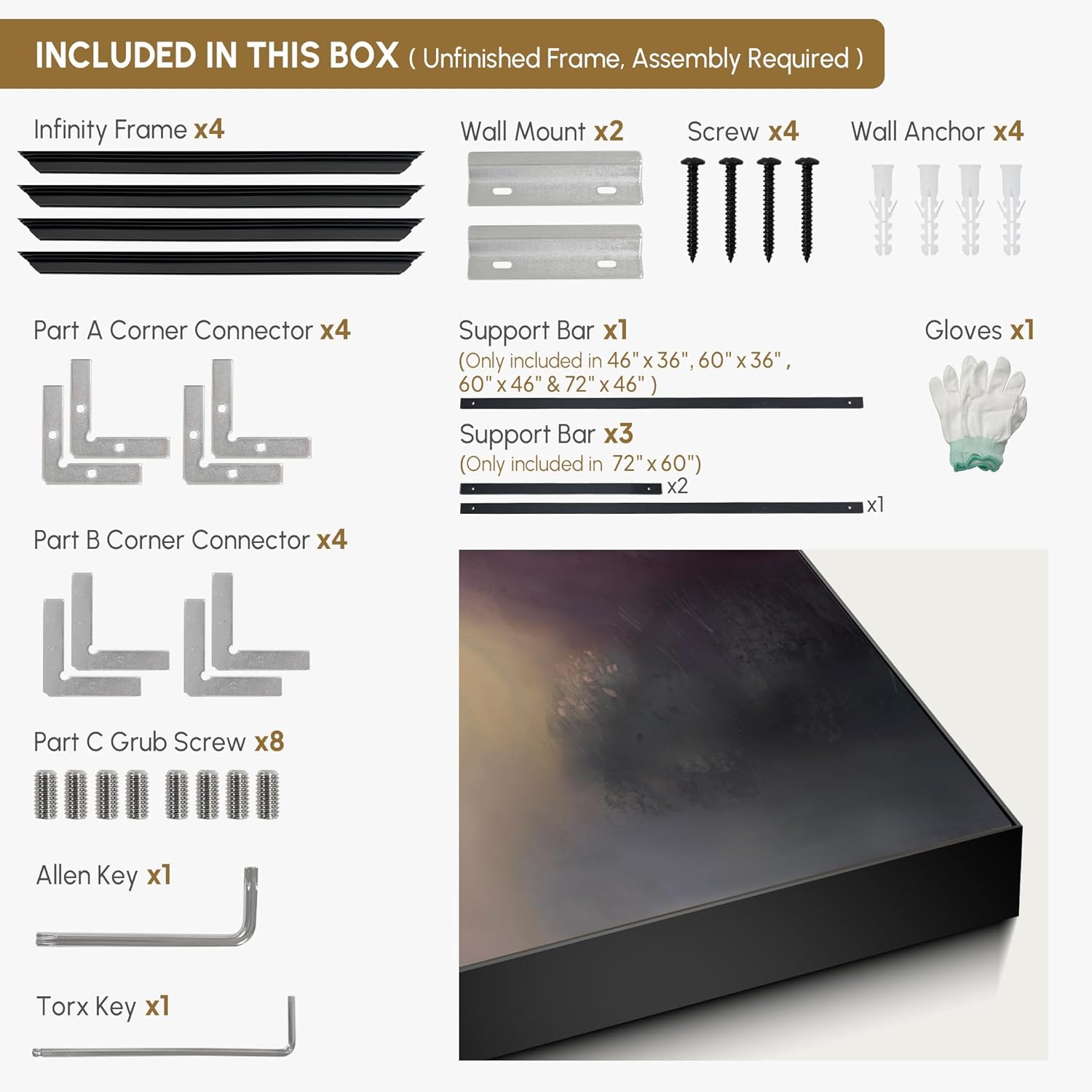 - Assembly Required: The artwork comes with the frame components unassembled. Don¡¯t worry - setup is straightforward and tool-friendly. For best results and accurate alignment, we recommend two people to ensure a smooth assembly and a stable, secure wall mount.