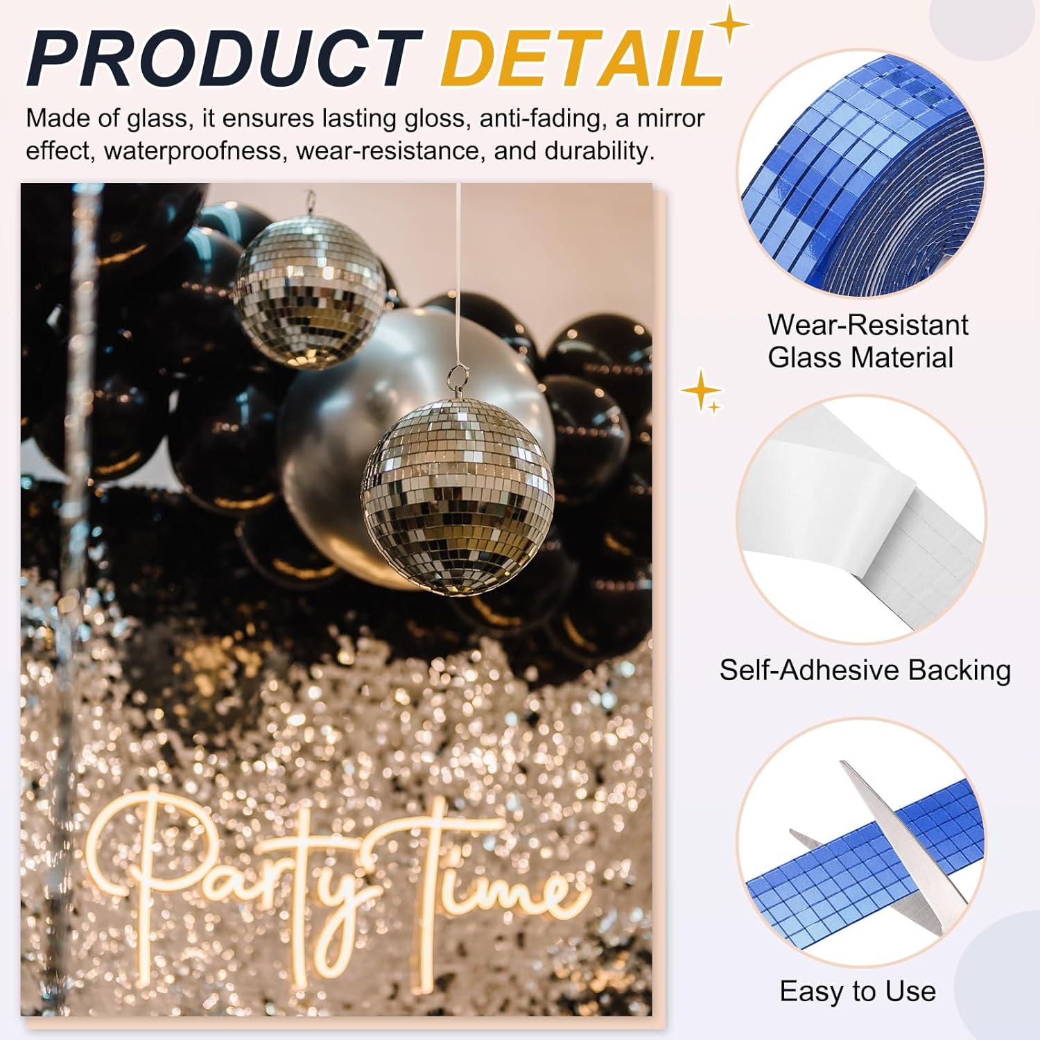 - Advantage: Wear-Resistant Glass Material: Made of glass, the glass material ensures lasting gloss and anti-fading and has a mirror effect, they are waterproof and wear-resistant, durable. Self-Adhesive Backing: Each tile comes with pre-applied adhesive, the tiles are not easy to fall off and easy to cut, and can be easily pasted on any clean, smooth surface without additional glue.