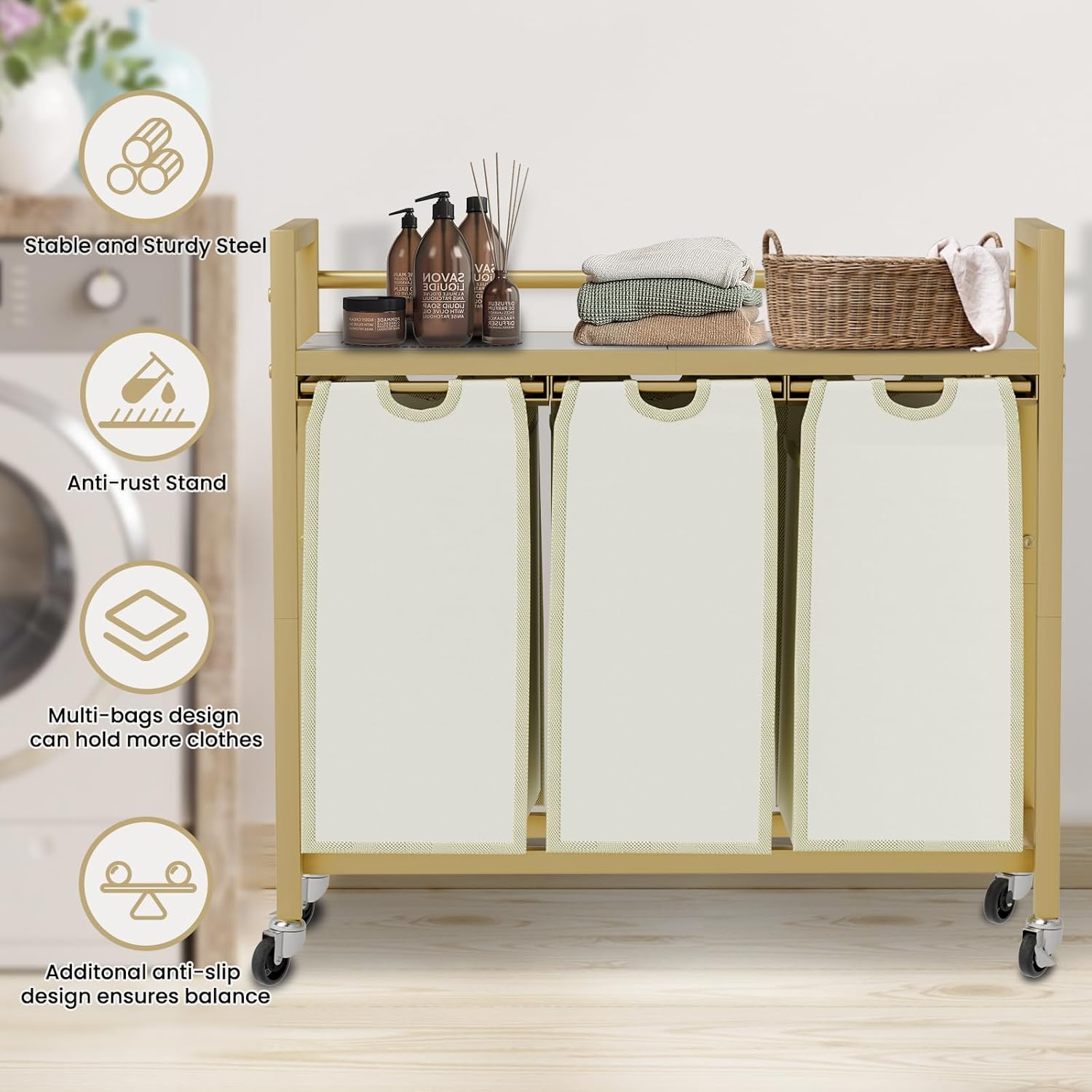 Laundry Hamper, Laundry Basket, Laundry Sorter with 3 Removable Bags, Clothes Basket with 3 Compartments, Wheels, Shelf for Laundry Room Bathroom Bedroom (3 Bags-Golden)