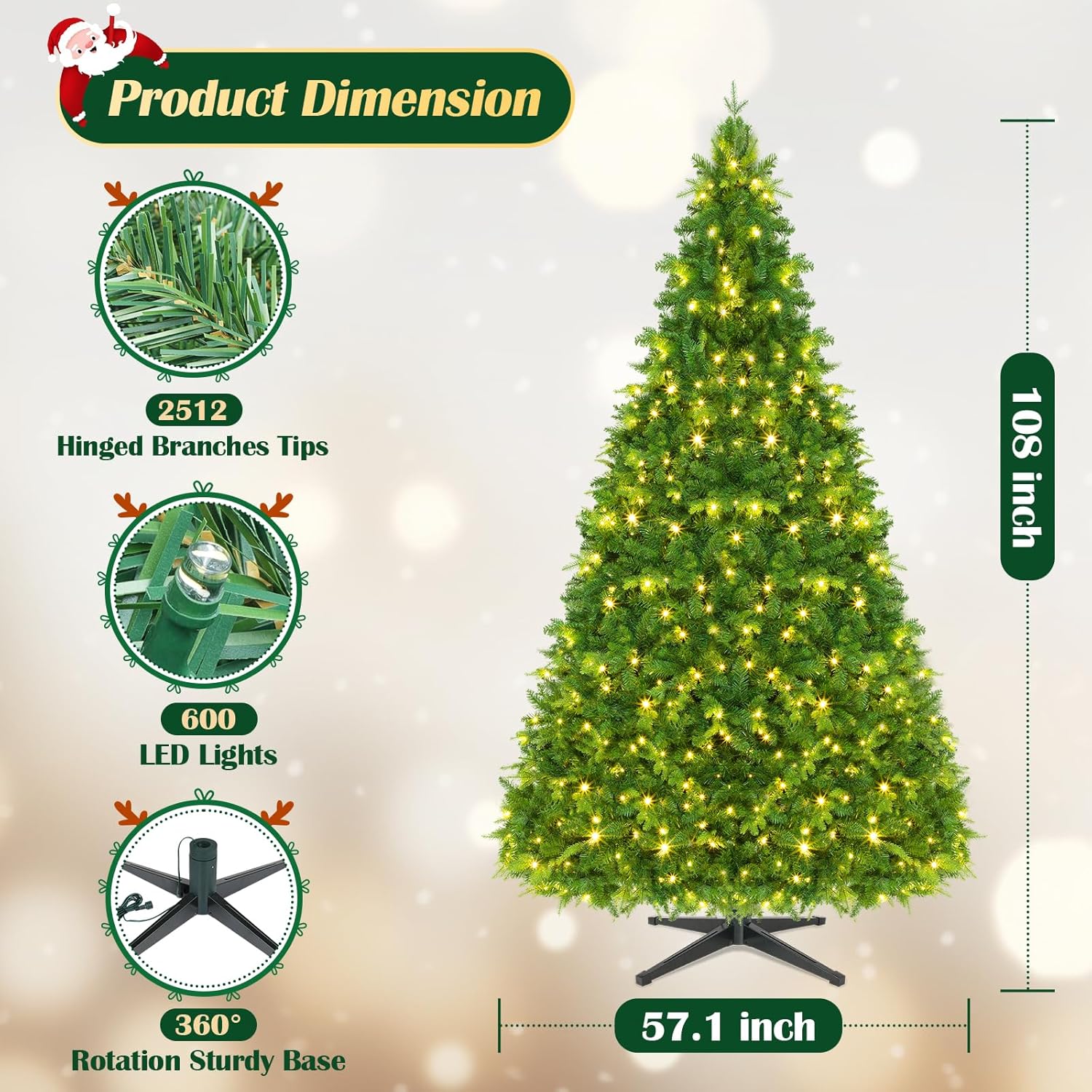 - 9FT Pre-Lit Christmas Tree, Premium Unlit Hinged Design, Easy Assembly in 3 Sections, Foldable Metal Stand, Realistic Look for Home Holiday Decor