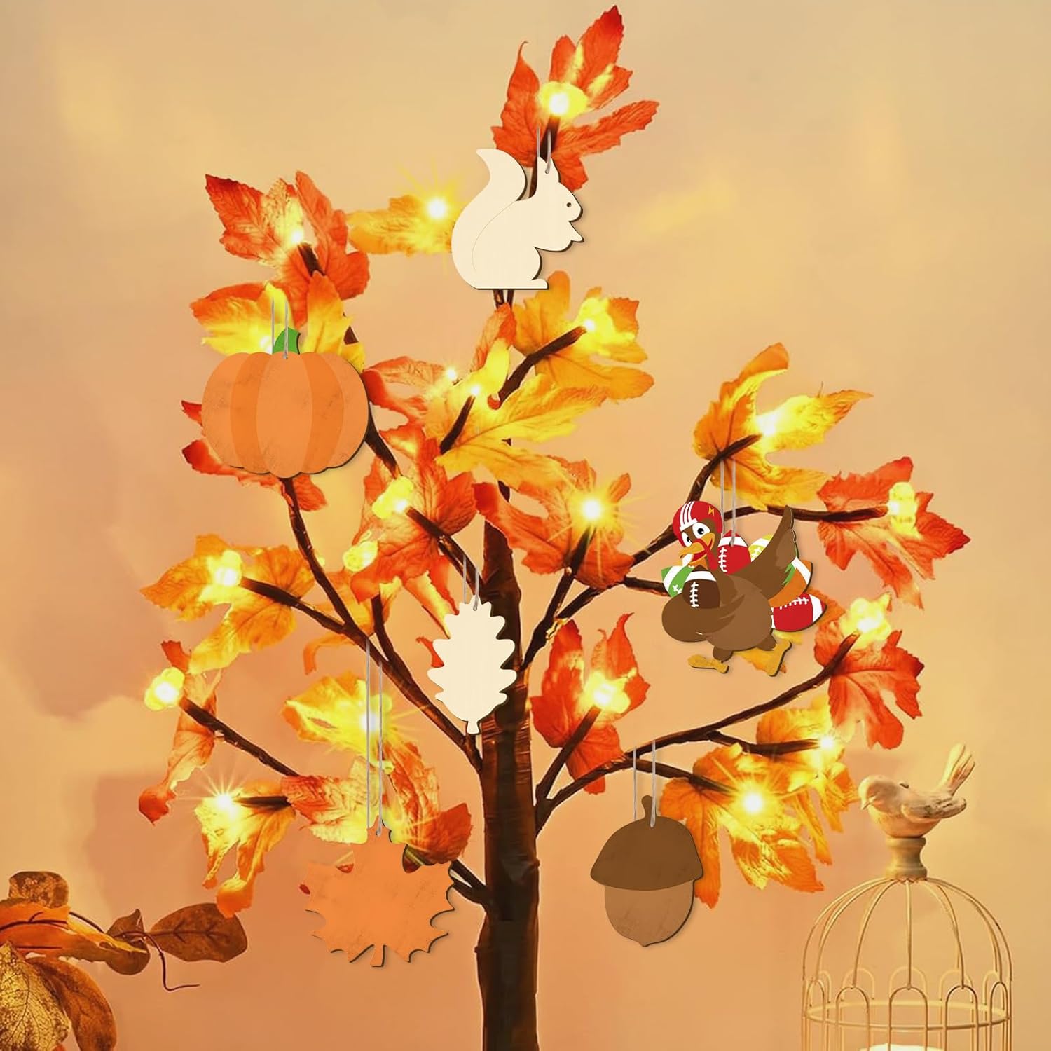 - Product Includes: 6 kinds of wooden pieces, such as turkey, Pumpkin, maple leaves,4 pieces of each kind, with 24 hemp ropes.