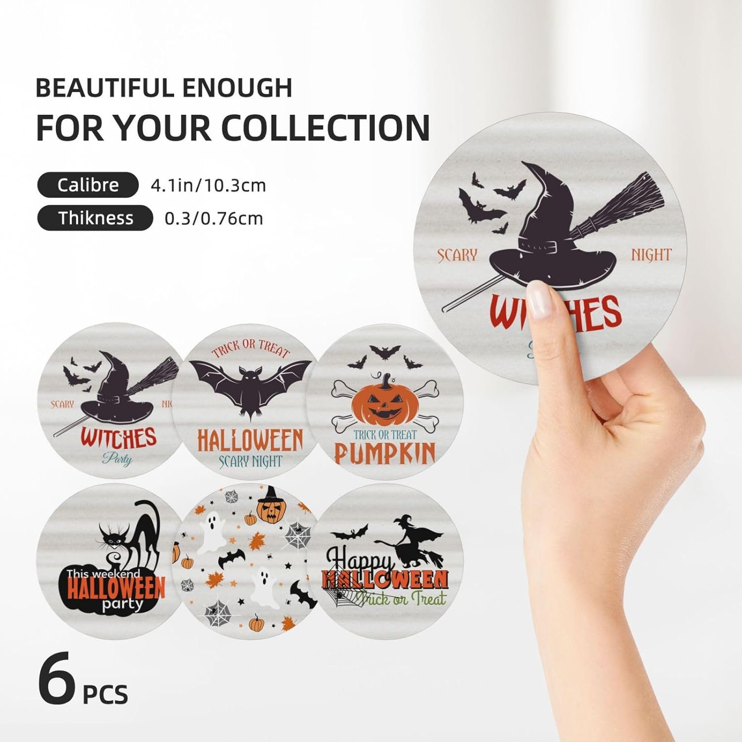 6 PCS Halloween Coasters with Metal Holder and Cork Base Ceramic Drink Coasters Absorbent Cup Mat Non-Slip for Home Kitchen Office Table Decor, 4 Inch Halloween 1