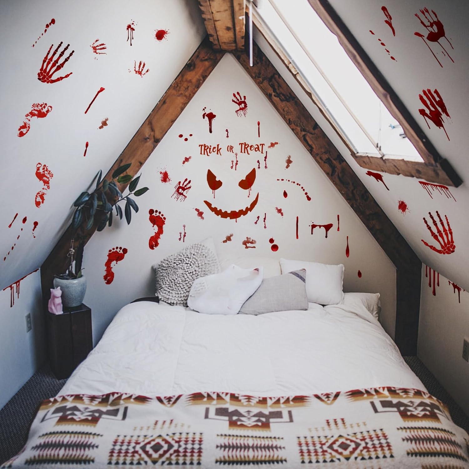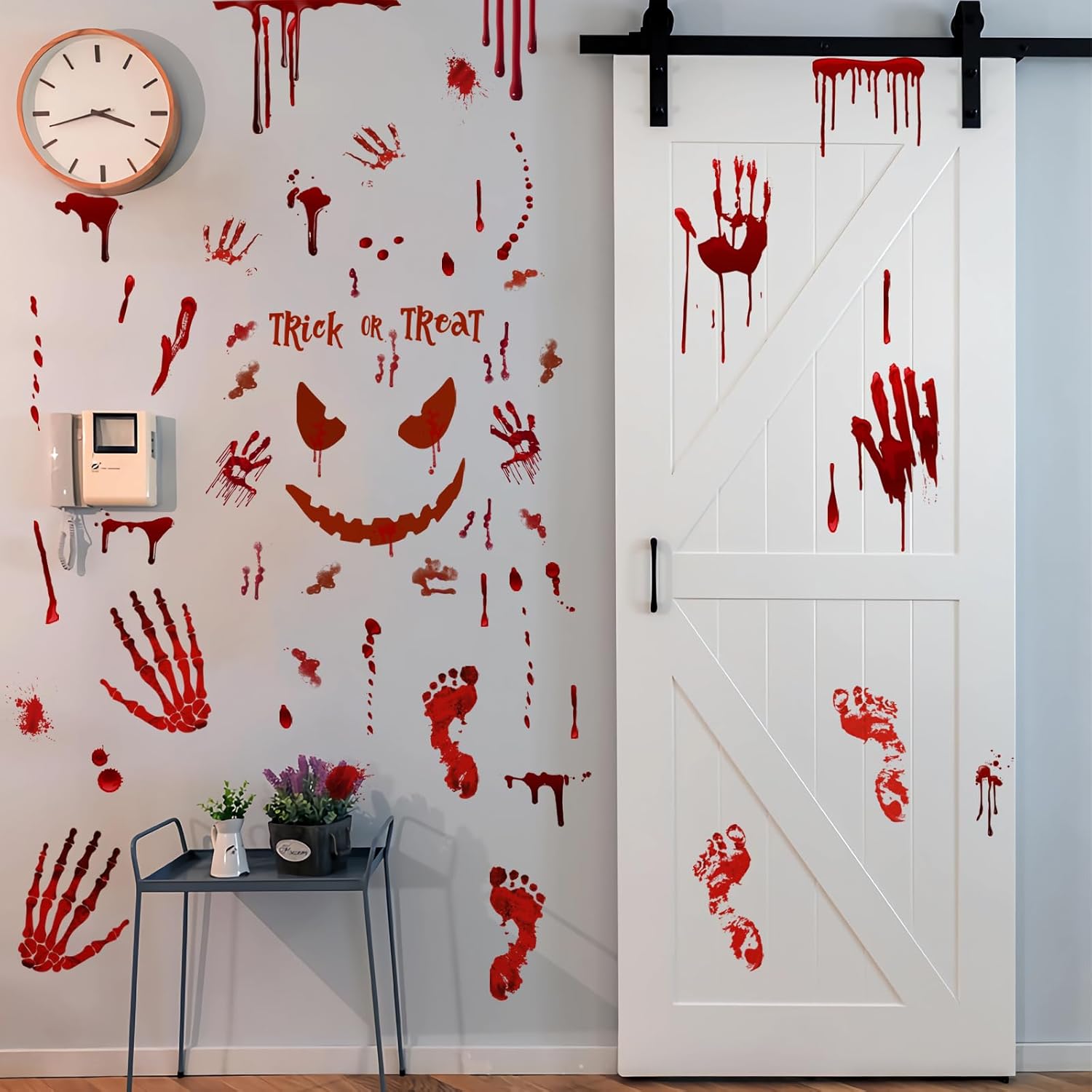 - Scary Halloween Decoration Set: You will get 4 Sheet/62Pcs horror halloween stickers, 11.4 x 11.4 inch and different sizes of the stickers, scary bloody handprint footprints, and bloodstain are perfect for halloween window door bathroom and wall decorations.