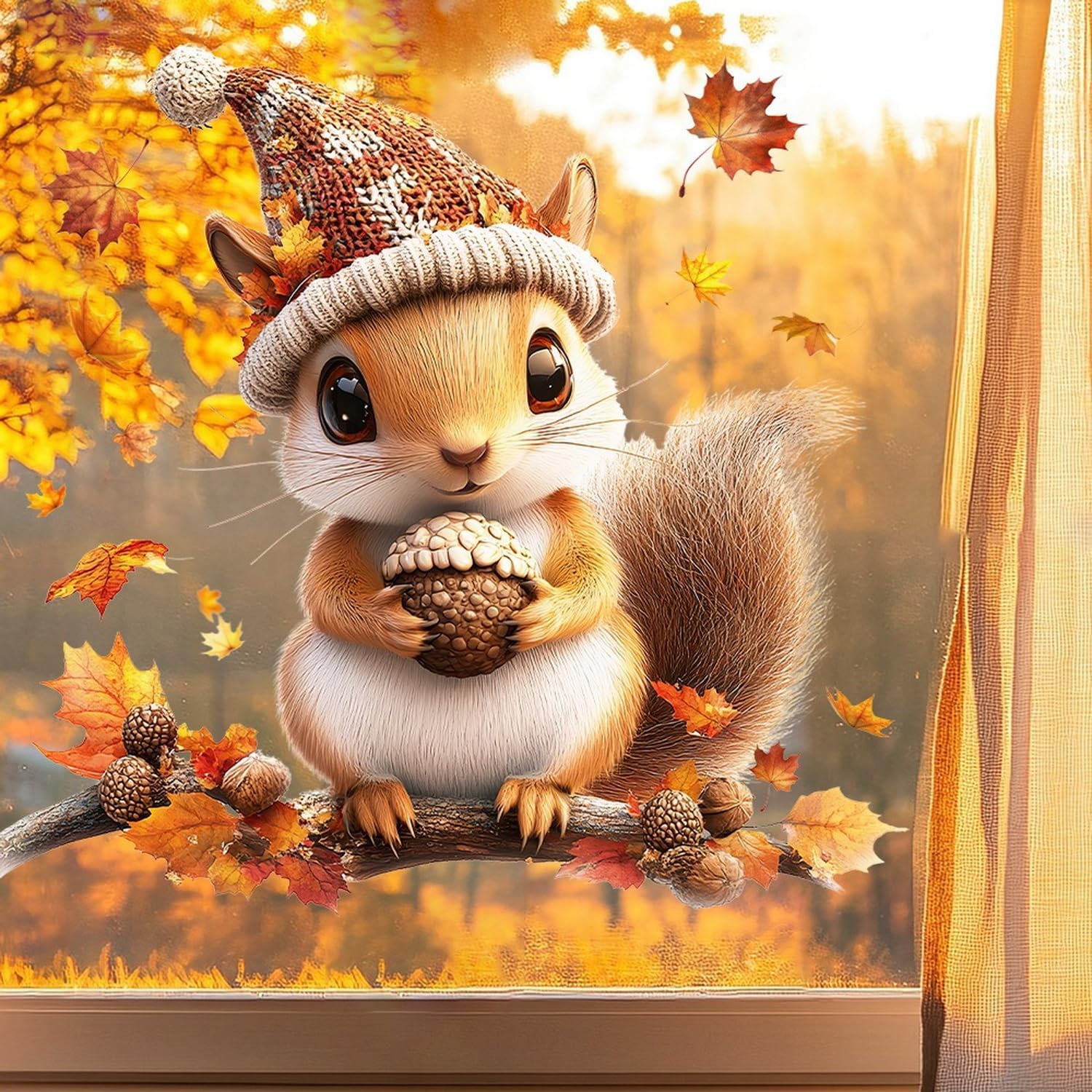 Fall Window Clings for Glass Thanksgiving Static Cling Window Decals 1PCS Cute Squirrel Maple Leaves Autumn Reusable Window Stickers Home School Office Decorations