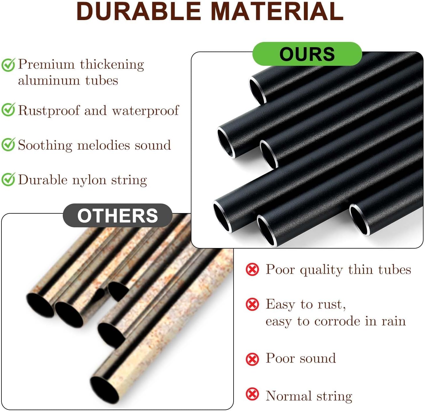 - Durable Quality: Built to endure seasons, our windchime tubes feature corrosion-resistant aluminum, durable nylon cords, and varnished excellent wood. Even in bad weather, they retain their charm, offering years of melodic durability for outdoor spaces.