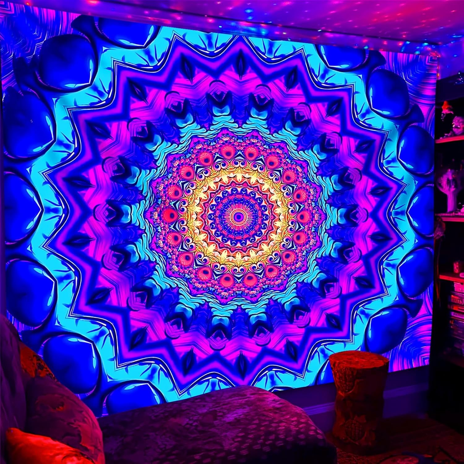 PSYHILAR Blacklight Mandala Tapestry for Bedroom, Black Light Posters for Adults and Teens, Colorful UV Reactive Aesthetic Bohemian Wall Art Decor (60 x 50 Inches)