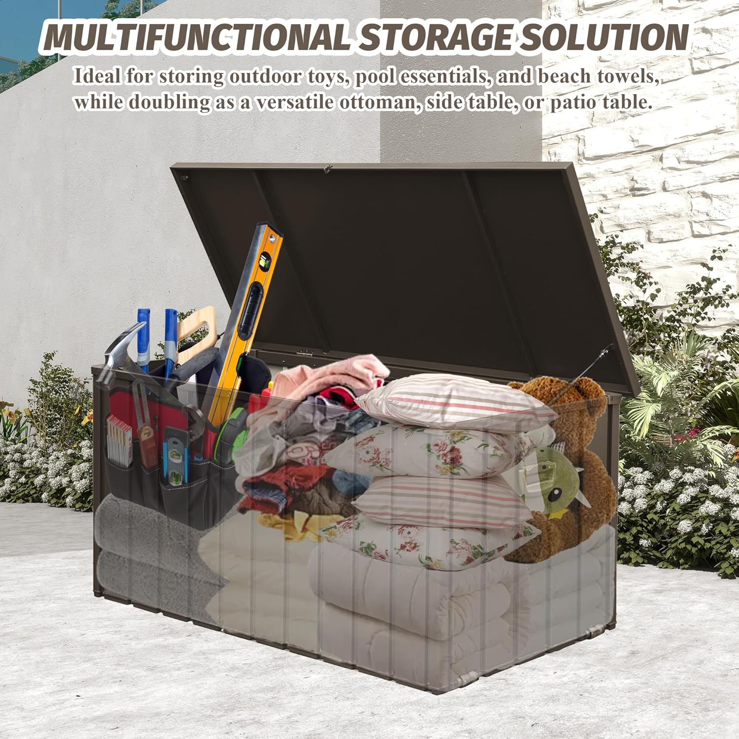 Domi Deck Box 190 Gallon, Waterproof Lockable Steel Outdoor Storage Container for Outside Cushions, Garden Tools and Pools Equipment, Brown