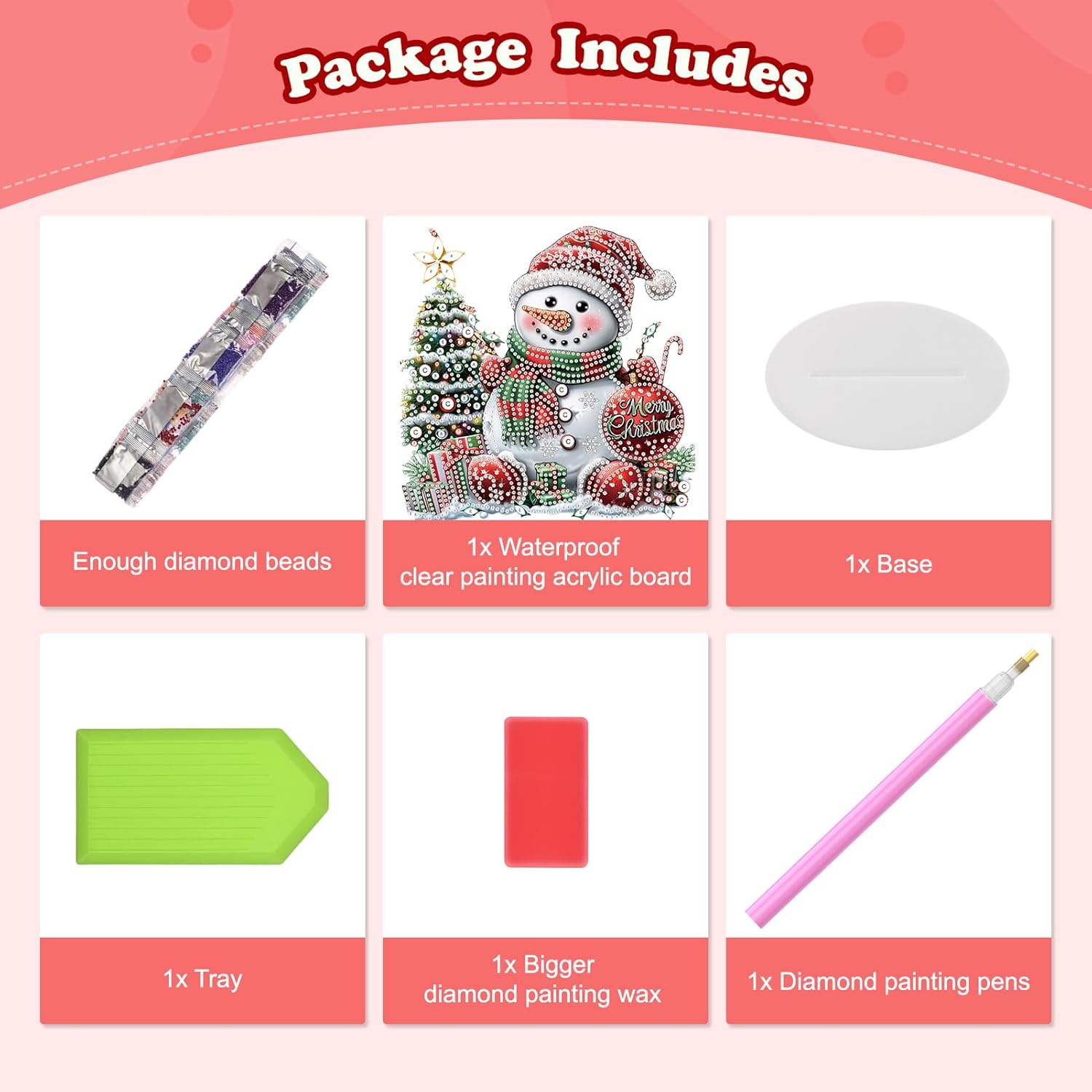 - What You’ll Receive: Includes waterproof clear painting acrylic board x1, base x1, diamond pen x1, tray x1, wax pad x1, plenty of diamonds, and a beautiful box—everything you need to start your diamond art project