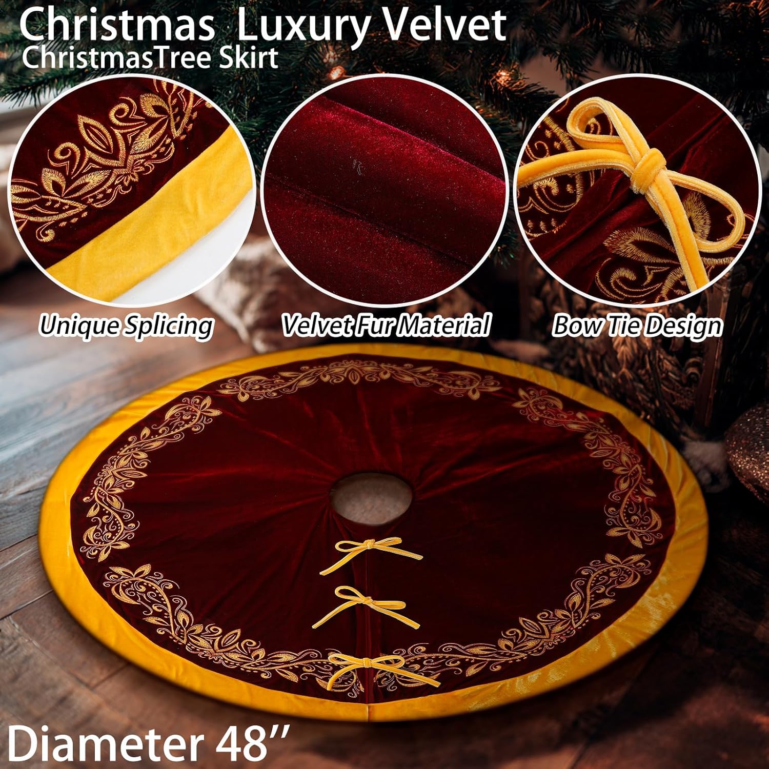 Luxury Velvet Christmas Tree Skirt 48 Inch Gold Victoria Embroidery Vintage Sparking Holly Tree Skirt for Holiday Party Rustic Xmas Decorations Home(Burgundy)