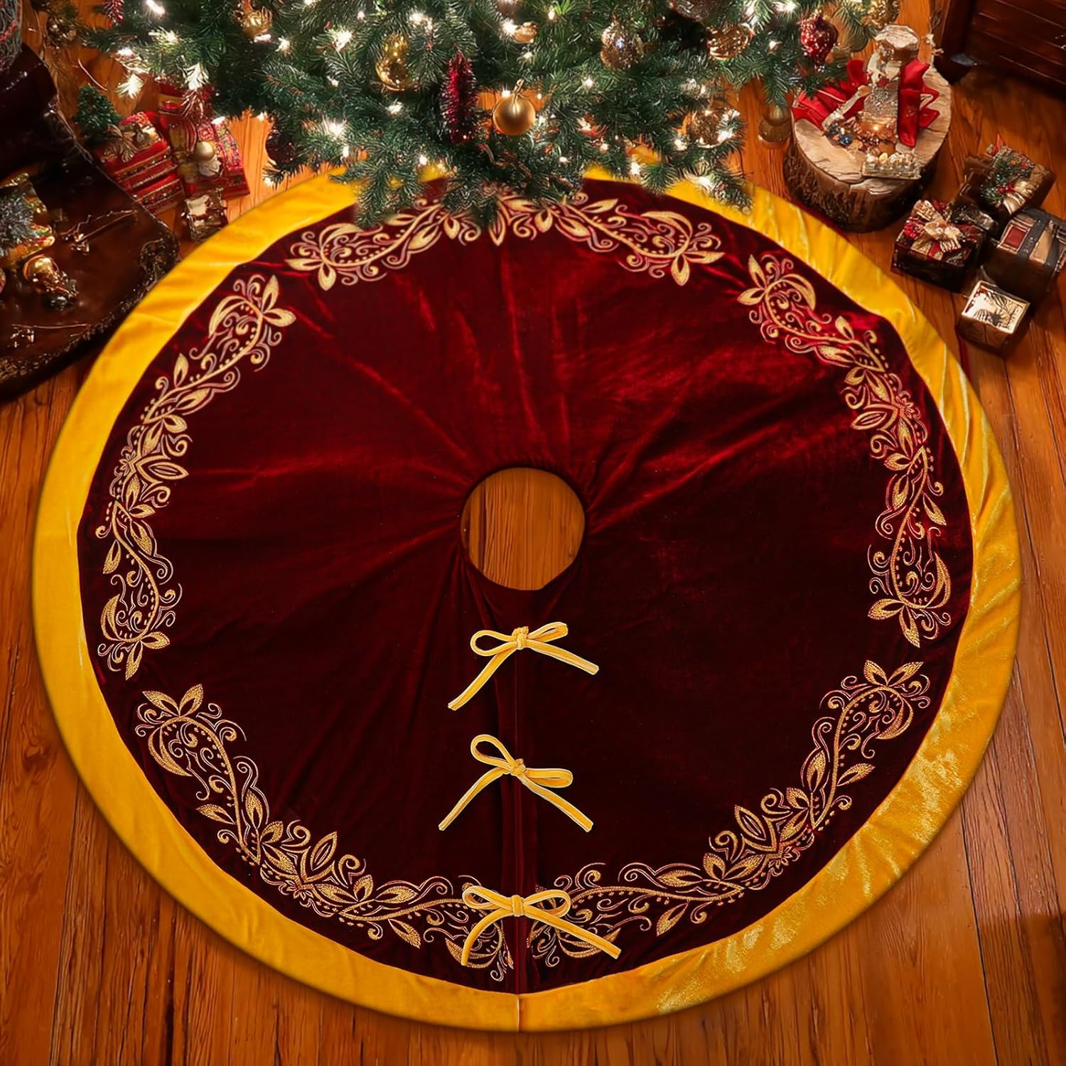 - Luxury Tree Skirt: the package contains 1 piece burgundy velvet tree skirt for Christmas tree with ornate gold embroidered scrollwork for a classic, vintage holiday look, nice for living room, bedroom, lobby, garden and other places