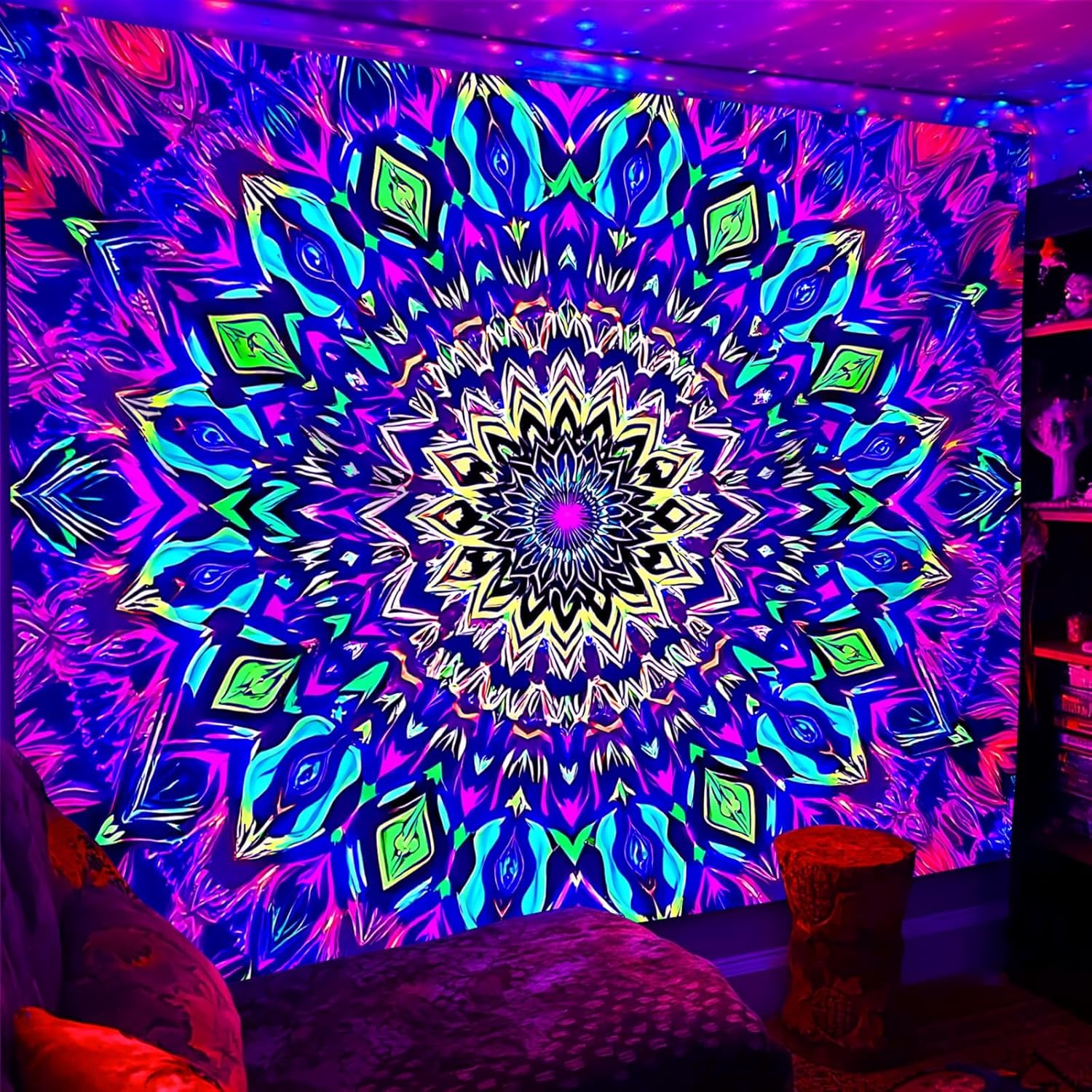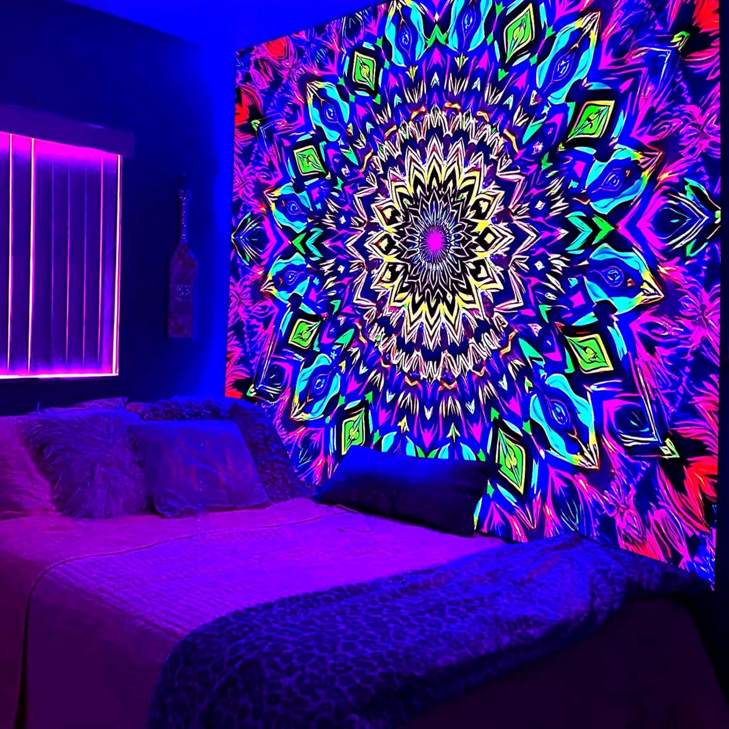 Blacklight Mandala Tapestry for Bedroom, XL Black Light Posters for Adults and Teens, Colorful UV Reactive Aesthetic Bohemian Wall Art Decor (90 x 70 Inches)