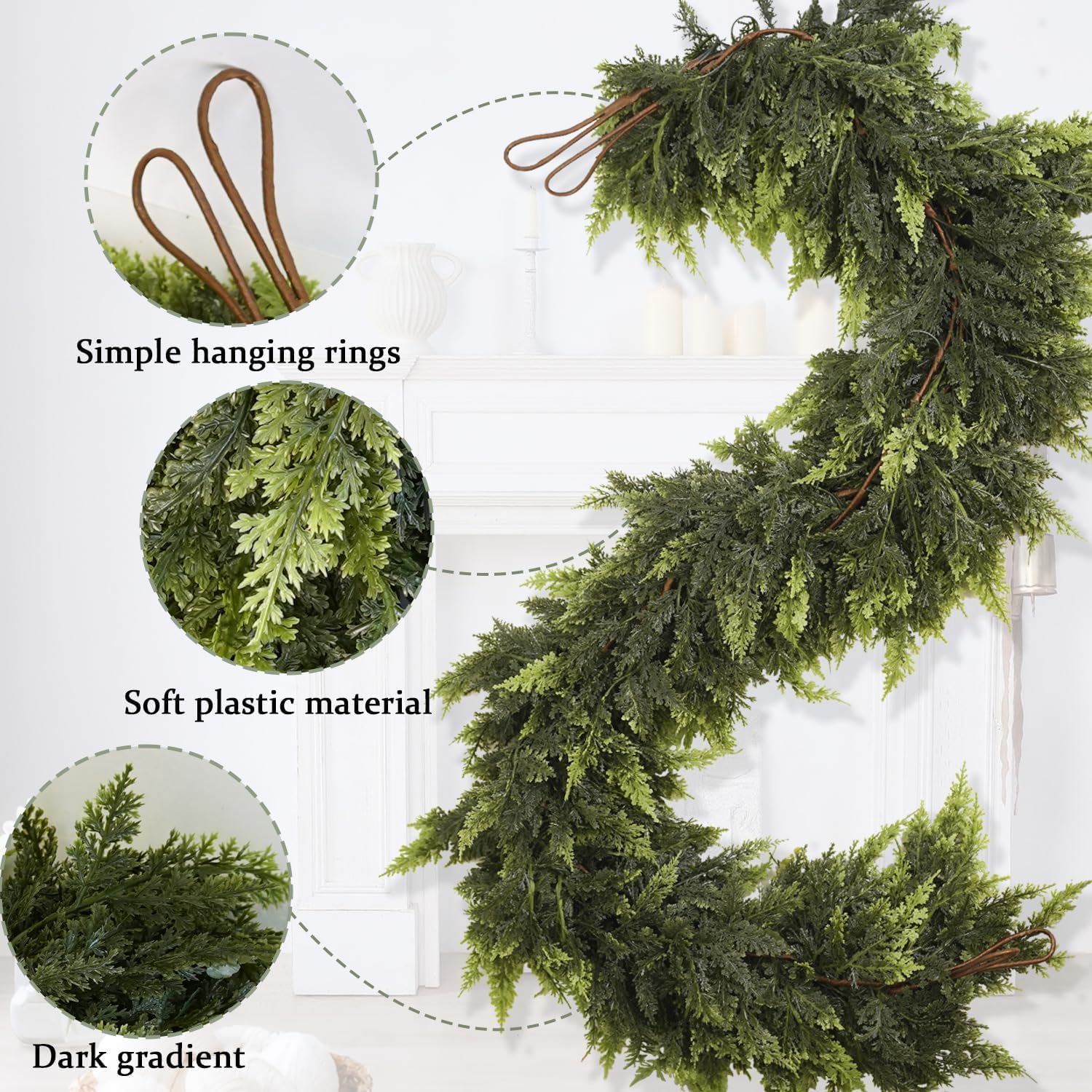 - 【Easy to Hang with Generous Coverage】This Christmas cedar garland measures 6 feet in length, with convenient built-in ring hooks for effortless hanging. It provides generous coverage, making it ideal for mantles, stairways, and windows. Use it alone for a simple look or combine with multiple garlands for a fuller, more impactful display